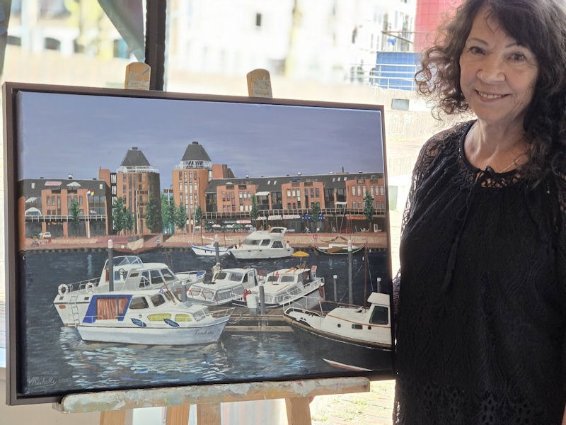 Hierboven een van de gast-exposanten: Michelle Friedlander bij een van haar werkstukken. De zo karakteristieke sfeer van Almere Haven.